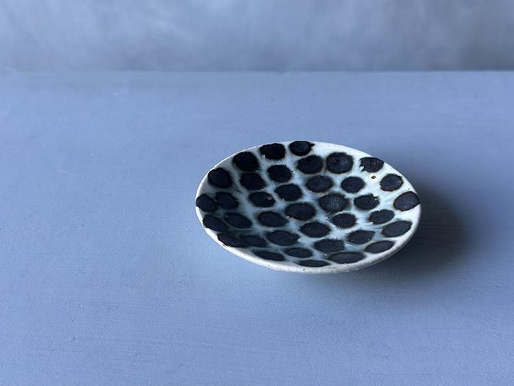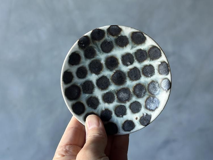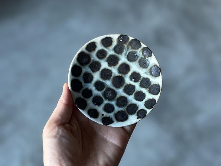 ドット模様がプリミティブな印象の楠田さんの墨絵の小皿。