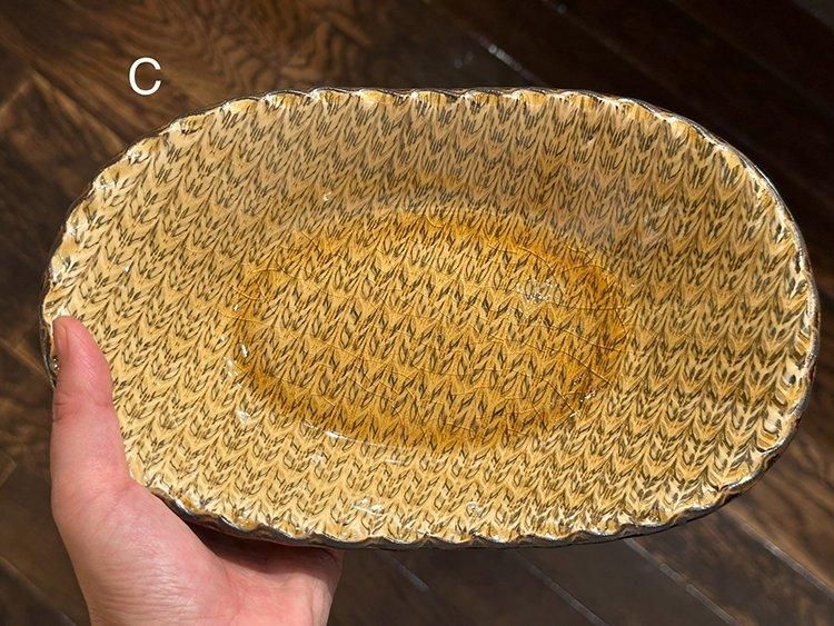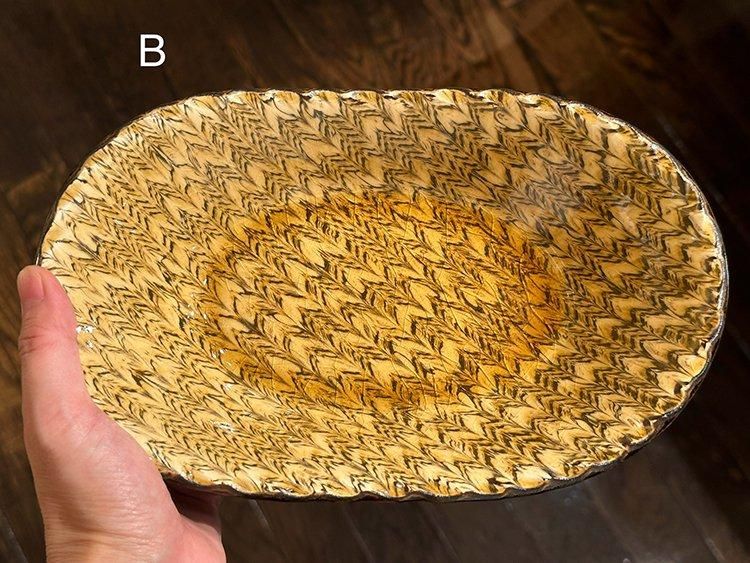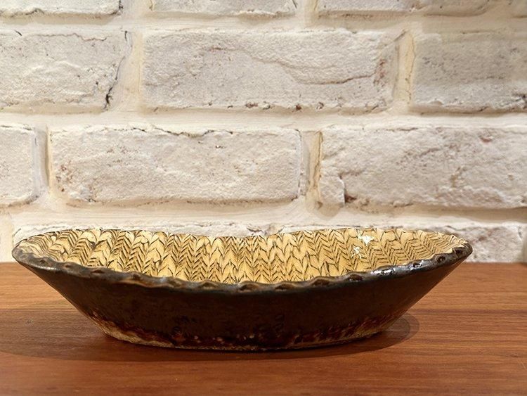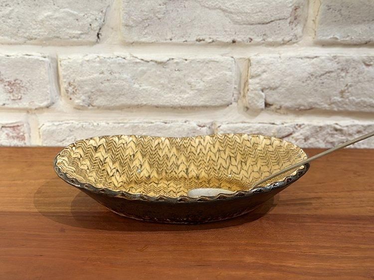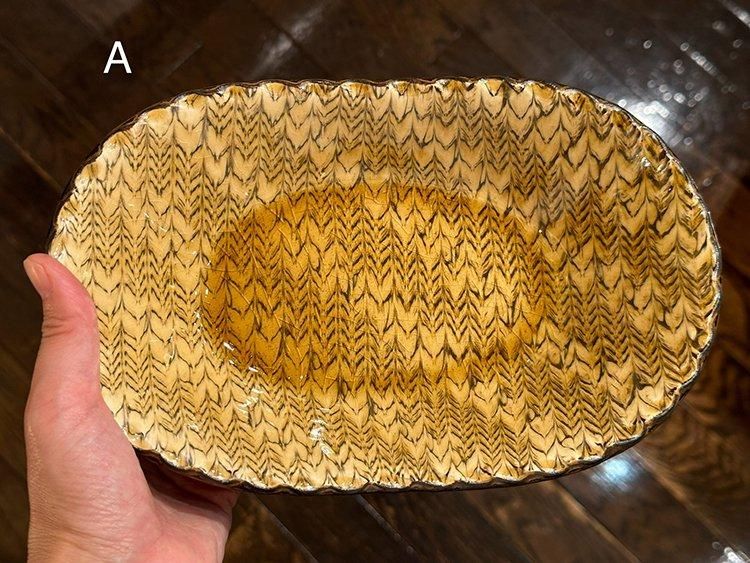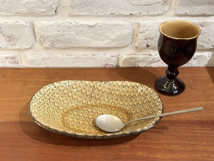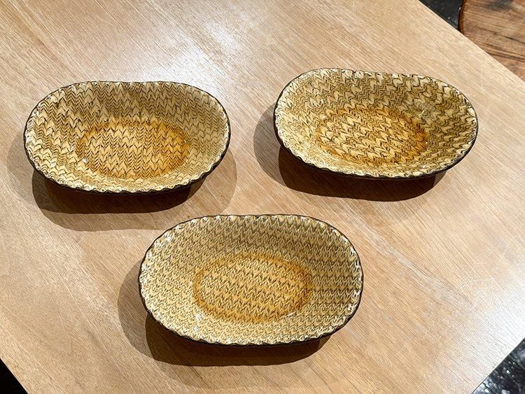 *スリップウェア:クリーム状の化粧土を筆やスポイト状の道具を用いて装飾した器