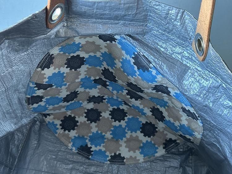 大胆に円形にパッチワークされた部分がバッグのアクセント。内側に当て布も施してあるので丈夫です。当て布は基本的に見えない部分ですが、ちょっとレトロな柄物が使用されていて、心くすぐられる可愛さがあります。